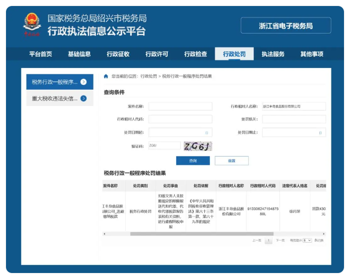 近日,齐鲁晚报·齐鲁壹点记者从国家税务总局绍兴市税务局行政执法信息公示平台获悉,浙江丰岛食品股份有限公司(丰岛食品 873707)因未按照规定的期限报送代扣代缴、代收代缴税款报告表和有关资料,进行虚假纳税申报的行为,被国家税务总局绍兴市税务局第二稽查局罚款43032.81元。