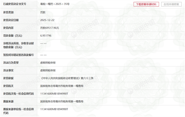 时隔8个月后,该公司又因税务违规被查处。2025年12月22日,国家税务总局亳州市税务局第一稽查局出具亳税一稽罚〔2025〕35号行政处罚决定书,认定其存在虚假纳税申报的违法行为。