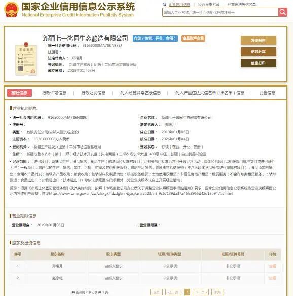 国家企业信用信息公示系统显示,新疆七一酱园生态酿造有限公司成立于2019年,注册资本3936万元人民币,法定代表人郑珺月。