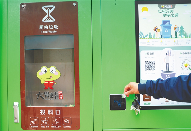 “自从有了这台餐厨降解机,每天的厨余垃圾都可以就近扔。没人扔垃圾的时候,机器面板就是关闭的,气味少、噪音小,而且垃圾能攒积分兑奖品,真是太方便了!”12月1日上午8时许,家住海口秀英区海悦东方小区居民姚芸华在上班之前,顺道把家里前一天晚上的厨余垃圾扔进了一台名叫“大胃蛙”的智能餐厨垃圾降解机。