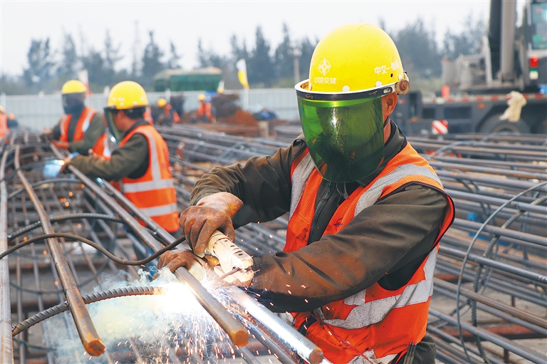 1月10日下午,在海口江东新区高品质饮用水水厂项目工地,工人在一起焊接钢筋笼。 通讯员 郝尉淞 摄