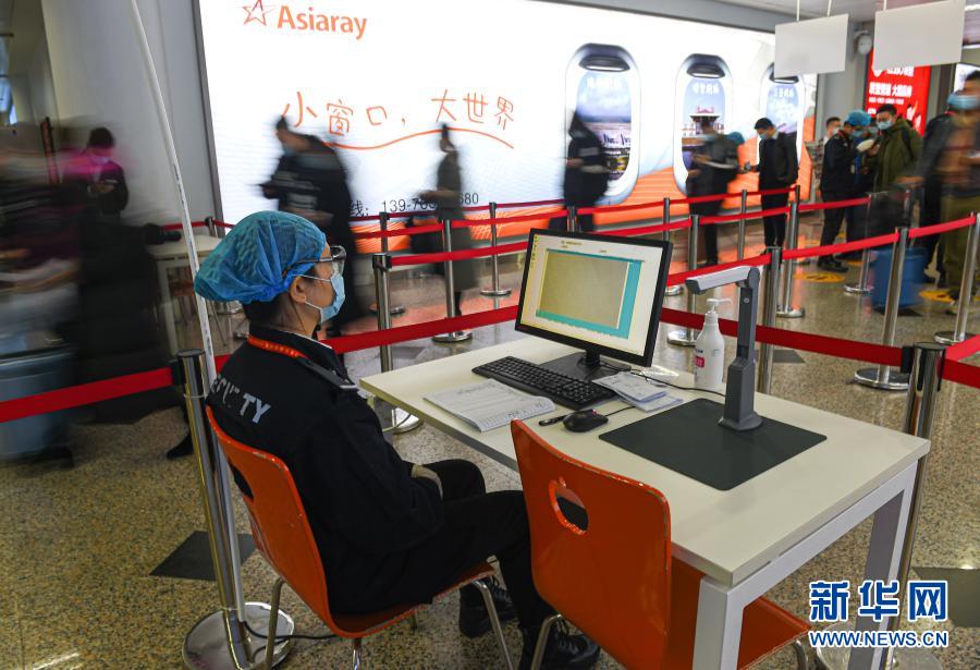 1月11日,工作人员在海口美兰国际机场查验进港旅客通信大数据行程卡。新华社记者 蒲晓旭 摄