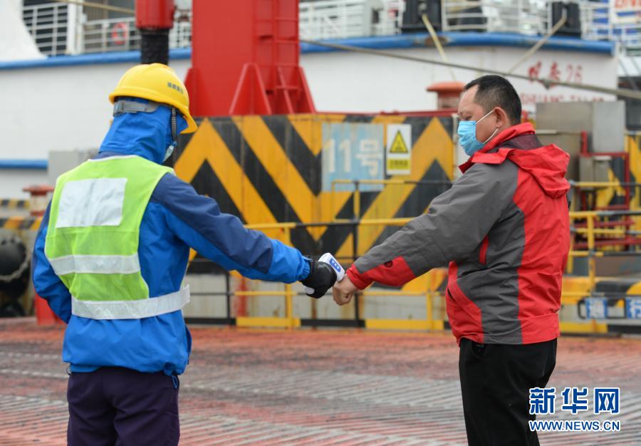 1月11日,在海南海口新海港,船员为乘船旅客检测体温。新华社记者 周佳谊 摄
