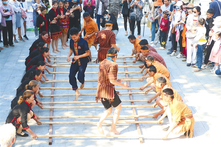 游客在尼下村码头欣赏黎族打柴舞表演。
