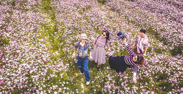 2月27日上午,昌江黎族自治县红林农场十二队花卉基地里的百亩波斯菊和百日草迎春绽放,汇聚成美丽花海,吸引众多游客前来观赏。文/海南日报记者 林书喜 约记者 吴文生