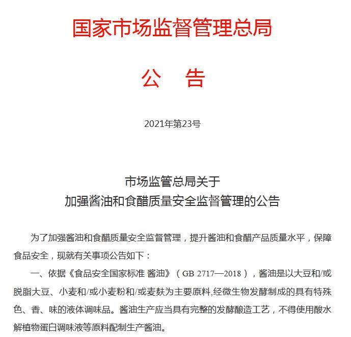公告称,为了加强酱油和食醋质量安全监督管理,提升酱油和食醋产品质量水平,保障食品安全,现就有关事项公告如下: