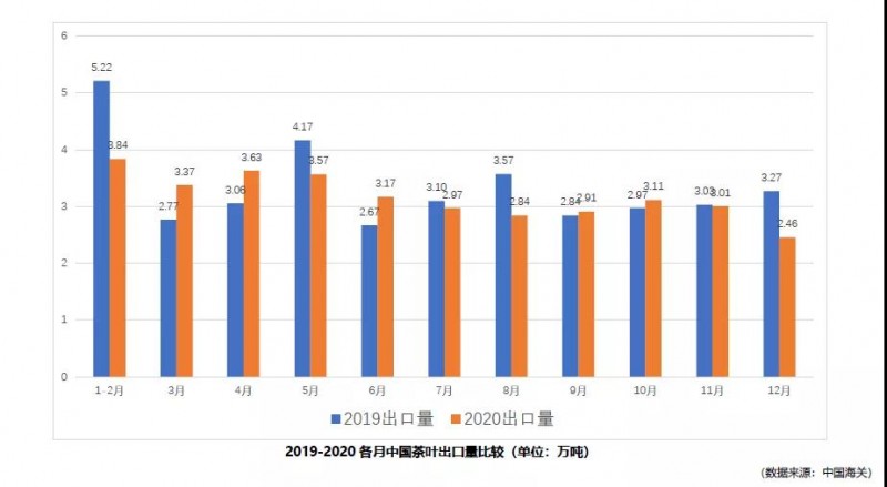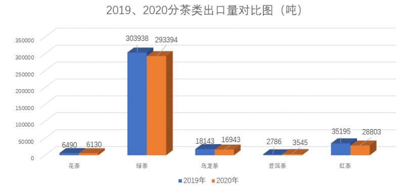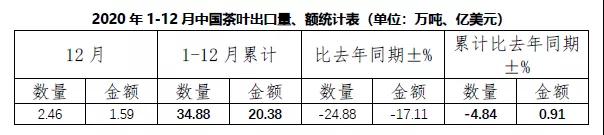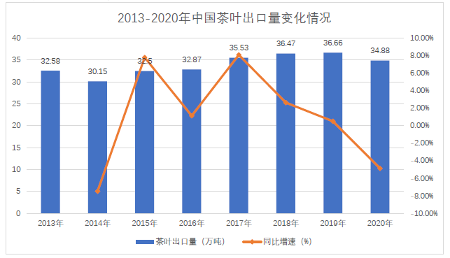 2020年1-12月,中国茶叶出口量总计为34.88万吨,比2019年全年减少1.77万吨,同比减少4.84%;这是自2014年以来,中国茶叶出口量首次出现下降。