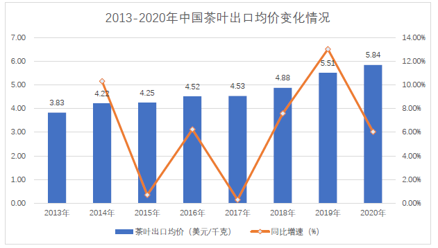2020年1-12月,中国茶叶出口均价为5.84美元/千克,同比上涨0.33美元/千克,涨幅6.04%。2013年以来,茶叶出口均价持续增长,年均复合增长率为6.23%,接连突破4美元/千克、5美元/千克大关,照现有复合增速,2021年有望突破6美元/千克。