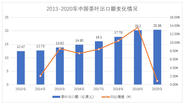 2020年1-12月,中国茶叶出口额累计为20.38亿美元,比2019年增加0.18亿美元,同比微增0.91%;2013年以来持续保持增长态势,年均复合增长率为7.27%,受出口量下降影响,2020年增速出现明显放缓。