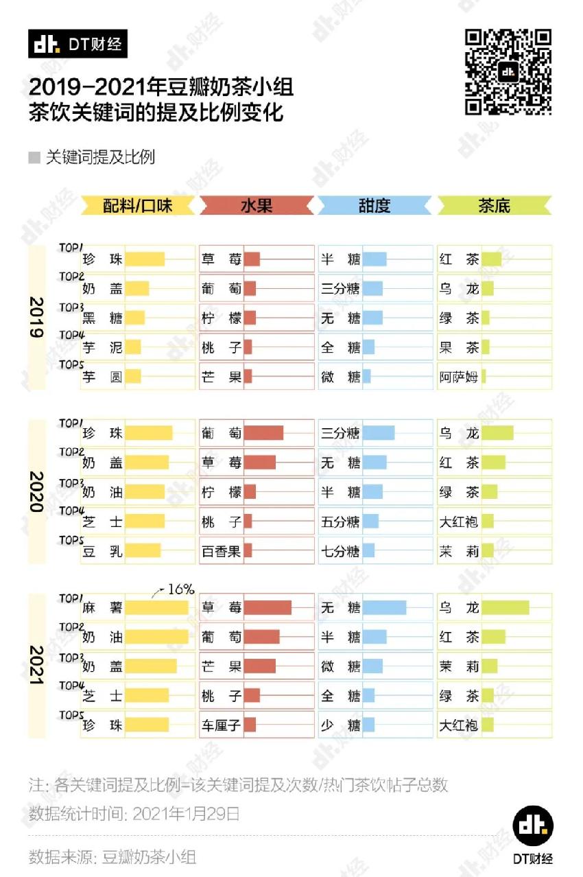 我们在豆瓣奶茶小组的所有帖子中,从水果、配料、甜度、茶底四个方面找到了近几年奶茶的变迁,也看到了年轻人对奶茶真实又矛盾的心理。