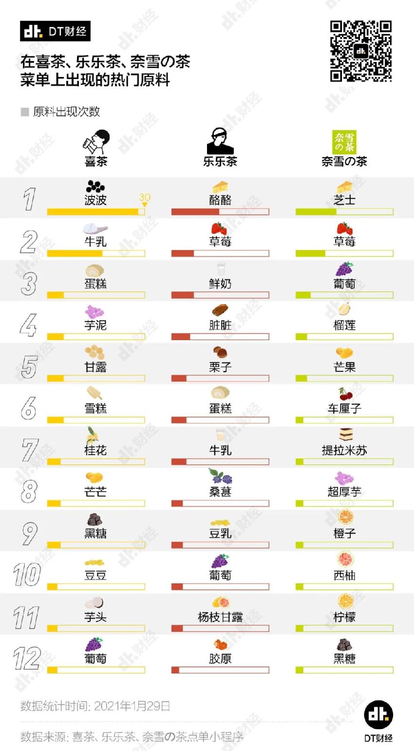考虑到产品花样翻新的频率、推广力度、人气值、美誉度等多个因素,我们在现制茶饮品牌中选择了喜茶、乐乐茶、奈雪的茶(下简称“奈雪”)三家品牌,并在它们的点单小程序里收集统计出了最热门的产品原料和配方。
