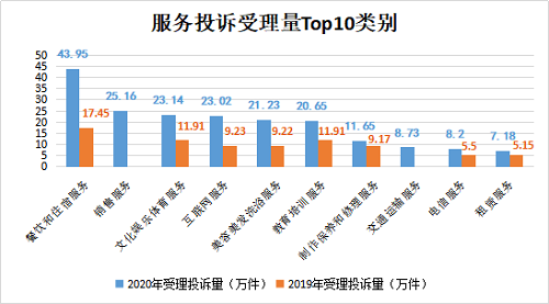 服务投诉排名靠前的是:餐饮和住宿服务43.95万件,销售服务25.16万件,文化娱乐体育服务23.14万件,互联网服务23.02万件,美容美发洗浴服务21.23万件。