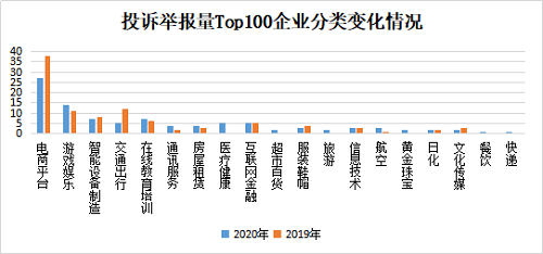 2020年,投诉举报共涉及企业287.86万家。电商平台、游戏娱乐、在线教育培训、智能设备制造等新兴行业占比较高,餐饮、服装鞋帽等传统行业占比较小。受疫情因素影响,医疗健康、游戏娱乐、房屋租赁涉及企业数量均有所上升。