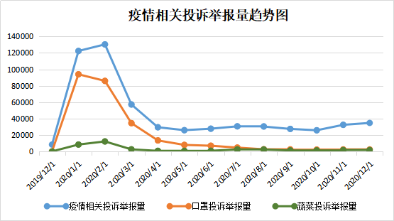 疫情发生以来,相关投诉举报主要集中在口罩、蔬菜等方面,全国市场监管部门迅速开展专项行动,共查核71.81万件疫情相关投诉举报,为消费者挽回经济损失9159.20万元;立案14.16万件,罚没金额1.23亿元。下半年以来,随着打击价格违法、假冒伪劣、野生动物非法交易各项措施力度加大,公众投诉举报数量逐步减少,与峰值日相比,相关投诉举报日接收量下降94%、口罩下降99%、蔬菜下降97%,相关物资假冒伪劣、价格等问题下降86%、99%,违法行为得到遏制,市场秩序逐步趋于稳定。