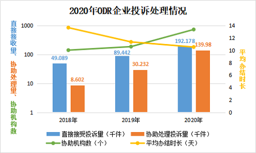 2020年,市场监管部门大力推进在线纠纷和解机制建设,努力把消费纠纷化解在源头、解决在基层、和解在企业。全国12315平台共发展ODR企业2.55万家,主动与消费者协商解决纠纷19.22万件,与传统调解方式相比,和解率高出6.21个百分点,平均处理时长缩短7.76天,消费者满意度4.07分(满分5分),ODR城市覆盖率由25.60%增加到91.11%。与2019年相比,2020年ODR机制运行质量有了明显提高,投诉处理量、办理效率、和解成功率、消费者满意度等各方面均有明显提升,维权效能日益突显。