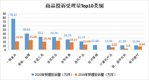 商品投诉排名靠前的是:一般食品78.12万件,服装鞋帽40.82万件,交通工具33.20万件,家居用品32.26万件,家用电器26.55万件。