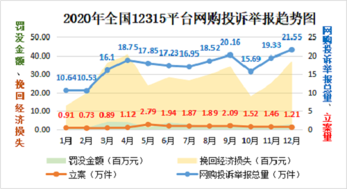 2020年,在中国经济运行稳步复苏、网上零售持续较快增长的背景下,网购诉求快速增长、热点频出。全国12315平台共受理网购投诉举报203.32万件,占平台投诉举报受理总量的28.04%,立案18.41万件,全国市场监管部门为消费者挽回经济损失3.04亿元。诉求热点主要集中在三方面: