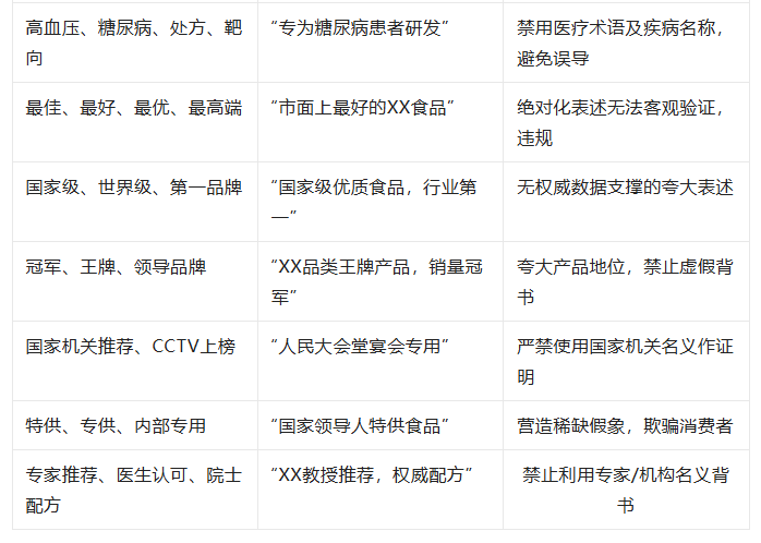 严禁使用无法客观验证的绝对化表述,以及虚构或滥用国家机关、专家等名义进行背书,这直接违反《广告法》与《食品安全法》。