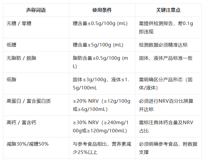 所有关于营养成分水平高、低、无的声称,都必须精确符合国标规定的含量阈值,并需有合规检测报告支持。