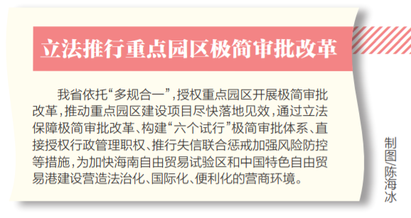 为最大限度简化行政审批,提高审批效率,我省依托“多规合一”,通过立法的方式授权重点园区开展极简审批改革,大力向园区放权,让园区“说话算数”,推动重点园区建设项目尽快落地见效,为海南自由贸易港建设营造法治化、国际化、便利化的营商环境。