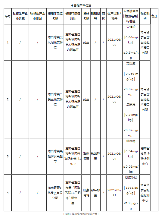 抽检信息显示,不合格食品为4批次食用农产品,均检出农兽药残留超标,分别为海口秀英梁凤阳蔬菜摊位销售的豇豆,检验项目灭蝇胺不符合食品安全国家标准规定;海口秀英严爱玉蔬菜摊位销售的豇豆,检验项目克百威、氧乐果不符合食品安全国家标准规定;海口秀英果唯伊水果超市销售的海南香蕉,检验项目吡虫啉不符合食品安全国家标准规定;海南旺豪时代投资有限公司销售的旺豪乌鸡,检验项目恩诺沙星不符合食品安全国家标准规定。