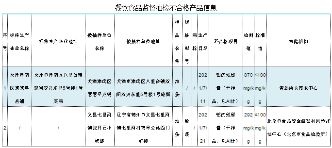 (二)天津津南区慧慧早点铺加工自制的油条,其中铝的残留量(干样品,以Al计)不符合食品安全国家标准规定。检验机构为青岛海关技术中心。