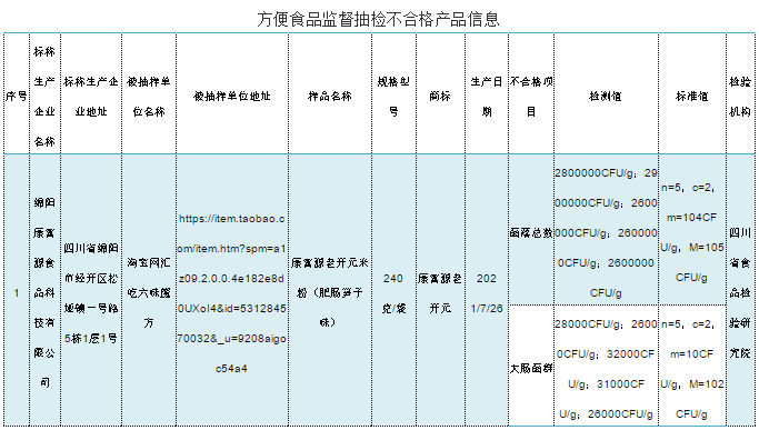 (一)淘宝网汇吃六味魔方(经营者为四川六味魔方电子商务有限公司)在淘宝网(网店)销售的、标称四川省绵阳康富源食品科技有限公司生产的康富源老开元米粉(肥肠笋子味),经四川省食品检验研究院检验发现,其中菌落总数、大肠菌群数不符合食品安全国家标准规定。四川省绵阳康富源食品科技有限公司对判定依据提出异议,四川省市场监管局核查后对其提出的异议不予认可。