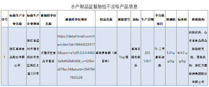天猫安密食品专营店(经营者为浙江省温州安密电子商务有限公司)在天猫商城(网店)销售的、标称浙江香海食品股份有限公司生产的香海黄鱼酥(海苔味),经山东省食品药品检验研究院检验发现,其中N-二甲基亚硝胺检测值不符合食品安全国家标准规定。浙江香海食品股份有限公司对检验结果提出异议,并申请复检;经浙江方圆检测集团股份有限公司复检后,维持初检结论。