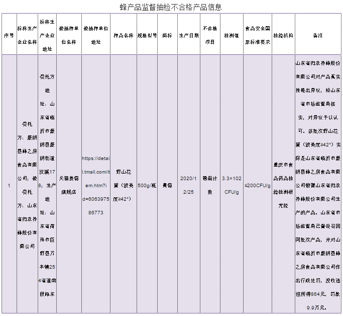 (二)天猫贵儒旗舰店(经营者为山东省临沂市蒙阴县蜂之房食品有限公司)在天猫商城(网店)销售的、标称山东省临沂市蒙阴县蜂之房食品有限公司委托山东省归农养蜂股份有限公司生产的野山花蜜(波美度≥42°),经重庆市食品药品检验检测研究院检验发现,其中霉菌计数不符合食品安全国家标准规定。山东省归农养蜂股份有限公司对产品真实性提出异议。山东省市场监管局核实后,确认该批次野山花蜜实际是山东省临沂市蒙阴县蜂之房食品有限公司假冒山东省归农养蜂股份有限公司生产的产品,认可提出的真实性异议。山东省市场监管局已责成召回不合格的假冒产品,并没收违法所得864元,罚款9.9万元。