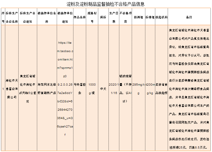 (四)淘宝网东北绿野富硒特产店(经营者为黑龙江省绥化市海伦市海兴镇绿野食品商店)在淘宝网(网店)销售的、标称黑龙江省绥化市海伦市天意薯业有限公司生产的马铃薯粉条,经吉林省食品检验所检验发现,其中铝的残留量(干样品,以Al计)不符合食品安全国家标准规定。黑龙江省绥化市海伦市天意薯业有限公司对产品真实性提出异议。黑龙江省市场监管局核实后,确认黑龙江省绥化市海伦市潘丽娜粉条商店自行分装后销售的该批次马铃薯粉条,不是黑龙江省绥化市海伦市天意薯业有限公司生产的,认可提出的真实性异议。黑龙江省市场监管局已责成召回不合格假冒产品,没收违法所得25元,罚款6.5万元。