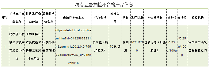天猫馋来香旗舰店(经营者为河南复多贸易有限公司)在天猫商城(网店)销售的、标称河南省商丘市民权县王桥镇张瑞波麻花加工小作坊生产的贡麻花(油炸糕点),其中过氧化值(以脂肪计)检测值不符合食品安全国家标准规定。检验机构为河南省产品质量监督检验院。