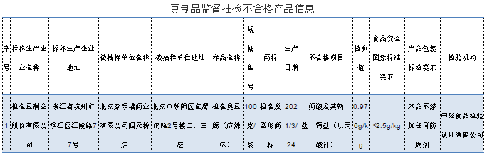 北京家乐福商业有限公司四元桥店销售的、标称浙江省杭州市祖名豆制品股份有限公司生产的祖名臭豆腐(麻辣味),经中轻食品检验认证有限公司检验发现,其中丙酸及其钠盐、钙盐(以丙酸计)检测值不符合产品标签标示要求。浙江省杭州市祖名豆制品股份有限公司对判定依据提出异议,浙江省市场监管局核查后对其提出的异议不予认可。