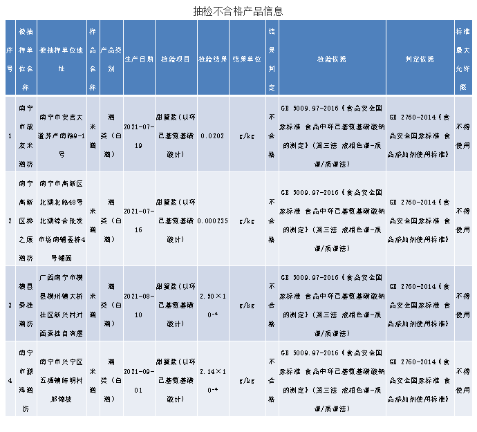 11月18日,南宁市市场监督管理局网站发布2021年白酒小作坊专项监督抽检信息。2021年7—10月,该局组织开展南宁市白酒小作坊生产专项监督抽检工作,共完成抽检126批次。此次专项检验项目为甜蜜素、甲醇,根据《食品安全国家标准 食品添加剂使用标准》(GB 2760-2014)检验和判定,所检项目检出合格样品122批次,不合格样品4批次。