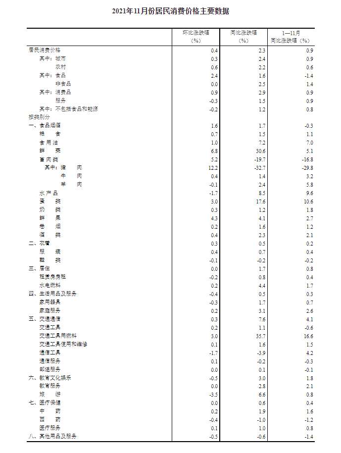 2021年11月份,全国居民消费价格同比上涨2.3%。其中,城市上涨2.4%,农村上涨2.2%;食品价格上涨1.6%,非食品价格上涨2.5%;消费品价格上涨2.9%,服务价格上涨1.5%。1—11月平均,全国居民消费价格比上年同期上涨0.9%。