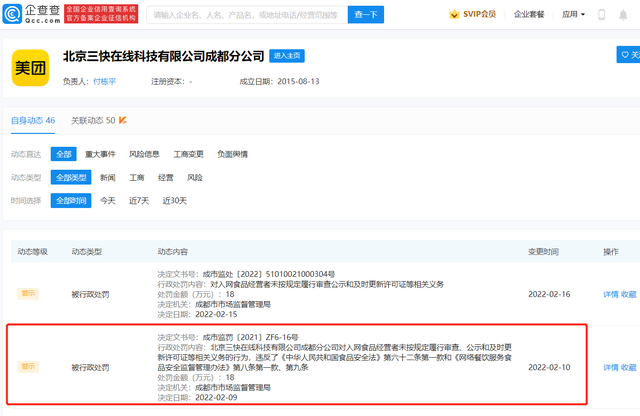 Tech星球2月24日消息,企查查APP显示,近日,北京三快在线科技有限公司成都分公司、上海拉扎斯信息科技有限公司成都分公司新增行政处罚信息,处罚事由均为对入网食品经营者未按规定履行审查、公示和及时更新许可证等相关义务,违反了《中华人民共和国食品安全法》第六十二条第一款和《网络餐饮服务食品安全监督管理办法》第八条第一款、第九条,处罚结果均为罚款18万元及没收违法所得等,决定机关为成都市市场监督管理局。