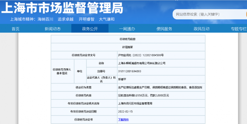 据悉,上海永辉杨浦超市有限公司申长路分公司因销售过期食品,被上海市闵行区市场监督管理局处以没收违法所得358元,罚款2万元。