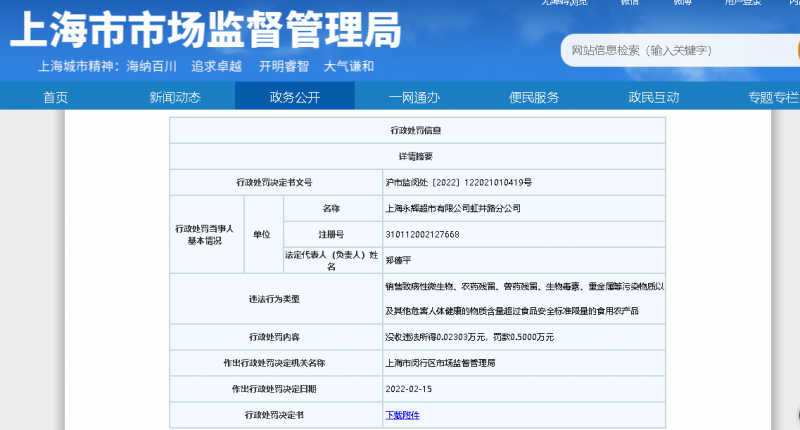近日,上海市市场监督管理局发布2则行政处罚信息,涉及永辉超市2家分公司,处罚决定日期均为2月15日,分别为“上海永辉杨浦超市有限公司申长路分公司涉嫌销售过期食品案”和“关于上海永辉超市有限公司虹井路分公司涉嫌销售禁止销售的食用农产品案”。