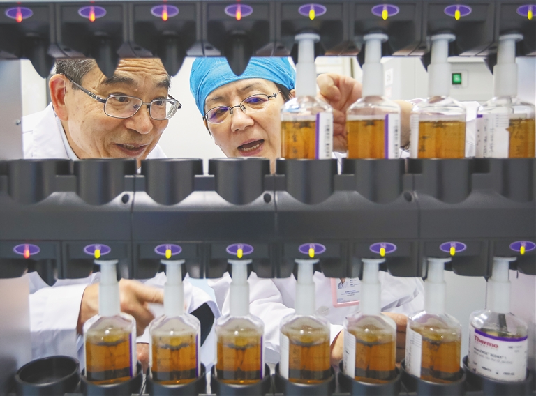 图②2019年4月17日,在博鳌乐城国际医疗旅游先行区,两位日本专家在查看实验样品。该园区通过引进国际高水平人才,推进医疗前沿研究。海南日报记者 袁琛 摄
