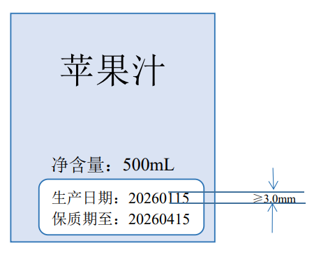 标示示例:见图3,在主要展示版面以对比明显的形式按照年、月、日的顺序清晰地标示了预包装食品的生产日期和保质期到期日,字体高度大于等于3.0毫米。