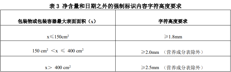 字符高度要求:净含量和日期之外的强制标识内容的字符高度要求,与包装物或包装容器最大表面面积有关,字符的最小高度要求见表3。