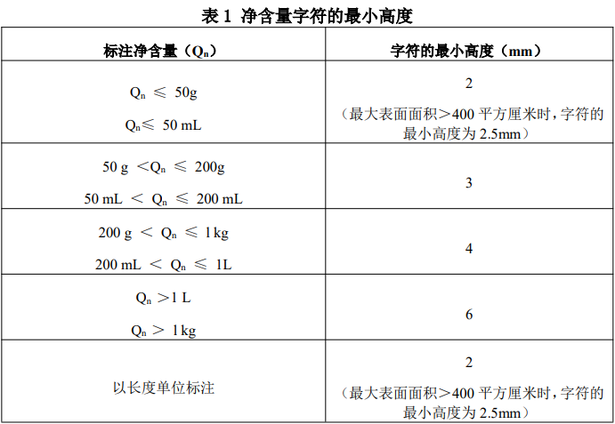字符高度要求:净含量的字符最小高度要求见表1。