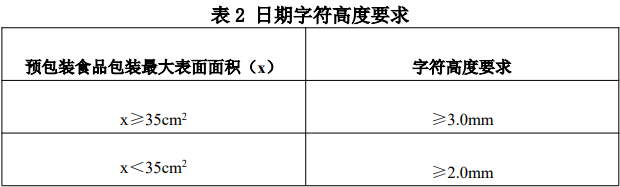 字符高度要求:日期的字符高度要求与包装最大表面面积有关,具体要求见表2。