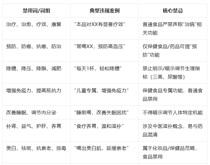 这类词汇一旦出现在普通食品标签上,直接构成严重违规,是市场监管重点打击对象,千万别踩雷!主要分为两大禁区:
