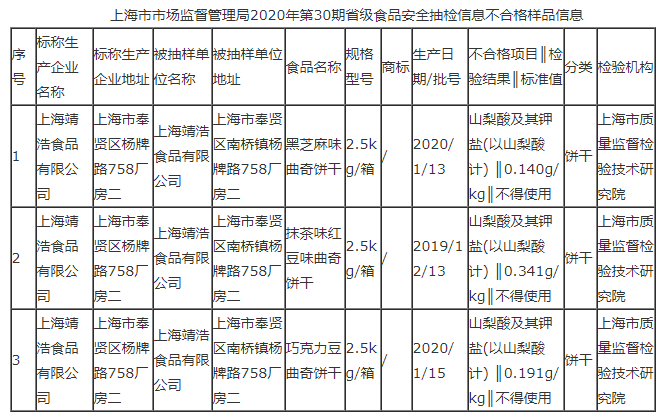 信息显示,不合格样品均为饼干,为:标称上海靖浩食品有限公司生产的黑芝麻味曲奇饼干(规格型号:2.5kg/箱 生产日期/批号:2020/1/13 )、抹茶味红豆味曲奇饼干(规格型号:2.5kg/箱 生产日期/批号:2019/12/13 )、巧克力豆曲奇饼干(规格型号:2.5kg/箱 生产日期/批号:2020/1/15 ),均检出山梨酸及其钾盐(以山梨酸计)不符合食品安全国家标准的规定。