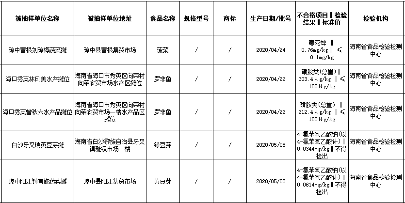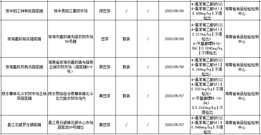 (七)琼海嘉积杨庆强菜摊销售的豆芽,检验项目4-氯苯氧乙酸钠(以4-氯苯氧乙酸计)和6-苄基腺嘌呤(6-BA)不符合食品安全国家标准规定。检验机构为海南省食品检验检测中心。