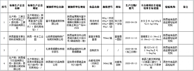 2批次食品检出质量不达标,分别为富平县嘉卓商贸有限公司销售的标称三原兴邦油品有限公司委托三原王小毛米线加工厂生产的(张兴邦+字母)牌鸡汤米线(麻辣味),1批次水分不符合产品明示标准和质量要求;山阳县客都购物广场商贸有限公司销售的标称陕西葚皇本草生物科技有限公司生产的(葚皇贡+图形)牌葚皇本草桑葚酒,1批次酒精度不符合产品明示标准和质量要求。