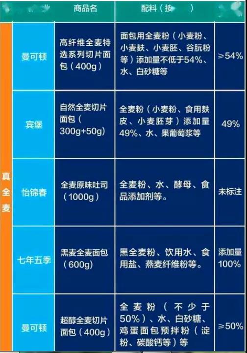 以此为依据,有媒体记者近期对线上线下渠道所售10个品牌的13款有“全麦”声称的面包进行统计发现,仅5款产品符合“真全麦”标准,分别是曼可顿高纤维全麦特选切片面包、曼可顿超醇全麦切片面包、宾堡自然全麦切片面包、怡锦春全麦原味吐司、七年五季黑麦全麦面包。