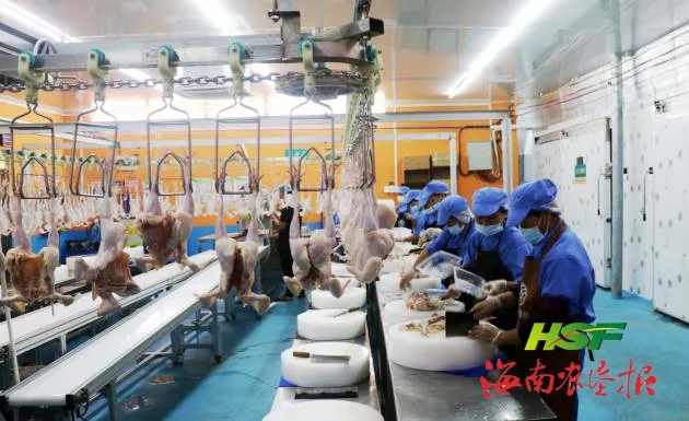 走进位于东昌农场公司十四队的海南四季椰林农牧有限公司,只见车间秩序井然,流水生产线从第一个生产车间贯穿到最后一个生产车间。一排排大小统一的支架,吊挂着宰杀好的文昌鸡,通过设备移动到工人面前进行加工。