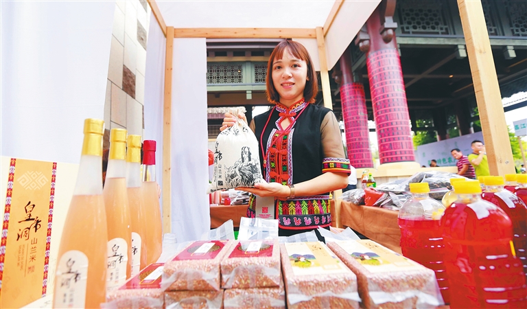 9月19日,2020年首届海南(昌江)乡村振兴产业峰会暨中国农民丰收节昌江庆祝活动在昌江棋子湾启动。图为活动启动仪式上一名工作人员在推介昌江特色农产品。记者 陈元才 摄