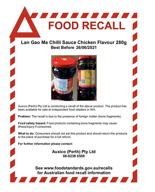 10月20日,新京报记者从澳新食品标准局(FSANZ)了解到,该局日前发布一则召回通告称,因产品存在骨头碎片,食品公司Auxico (Perth) Pty Ltd正在召回一款老干妈辣椒酱。